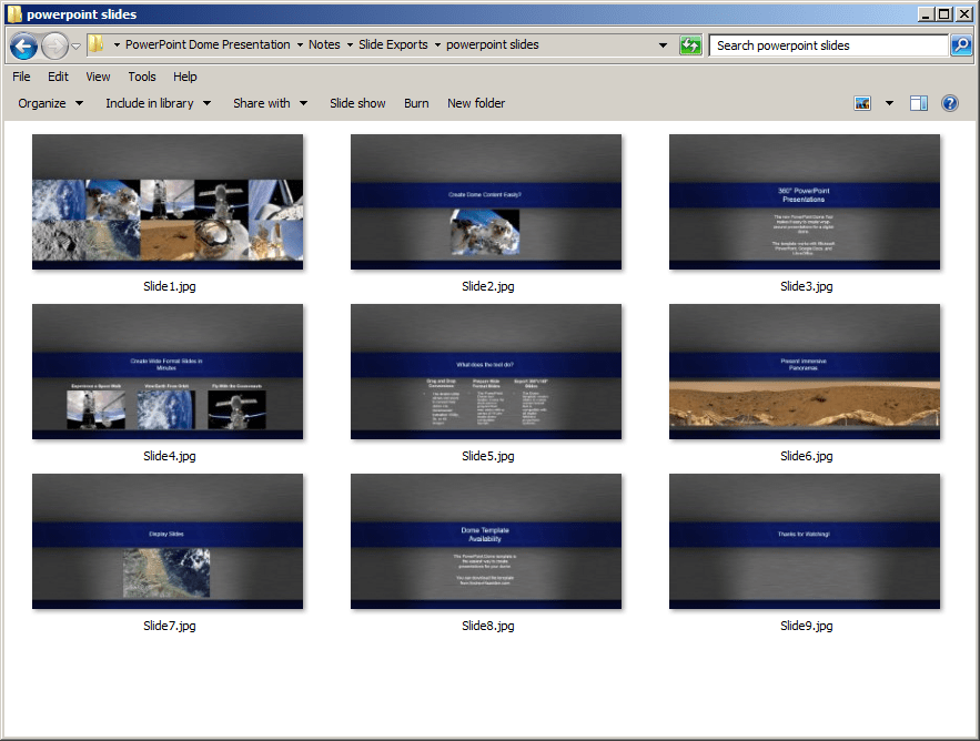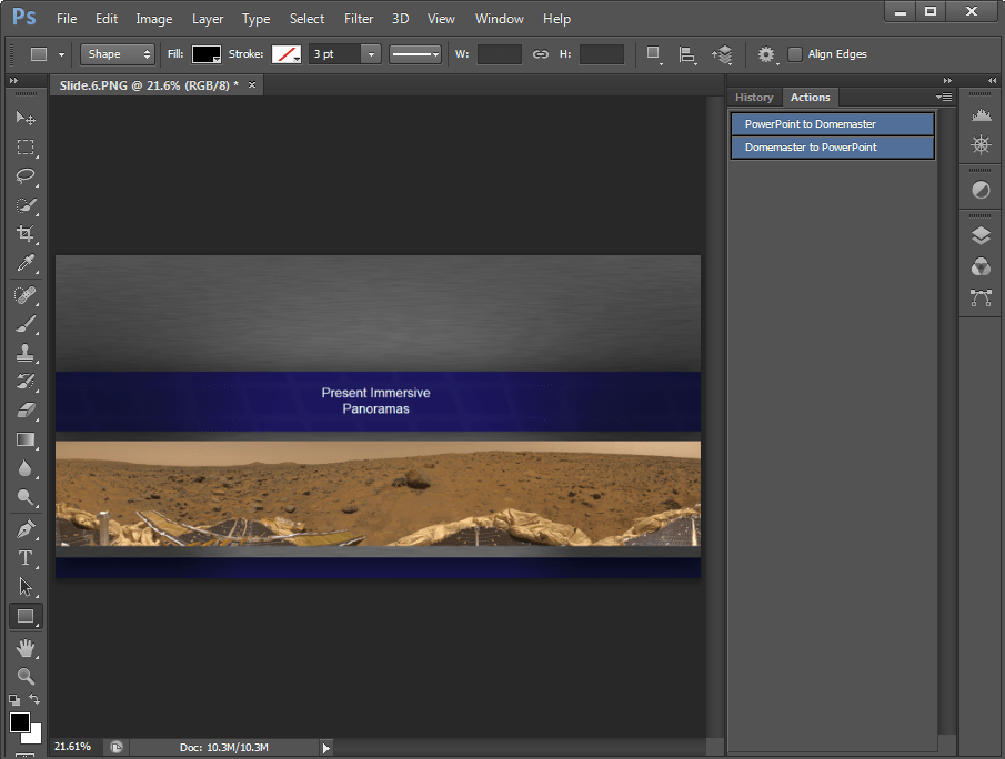 La plantilla de domo de PowerPoint viene con un programa adicional Photoshop action and droplet para convertir sus diapositivas de PowerPoint exportadas en formato.PNG o.JPG en imágenes angulares de ojo de pez con formato «domemaster».