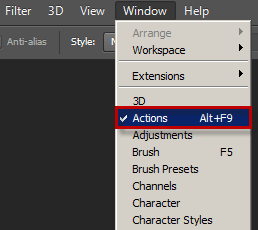 Comience abriendo Adobe Photoshop. Navegue hasta el menú «Ventana» y seleccione el punto de menú «Acciones».