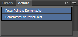 En la Acción: En el menú que aparece, seleccione «PowerPoint to Domemaster». Esto le dirá a la gota que ejecute la acción personalizada que crea una imagen con formato de domemaster cuando se inicia la gota.