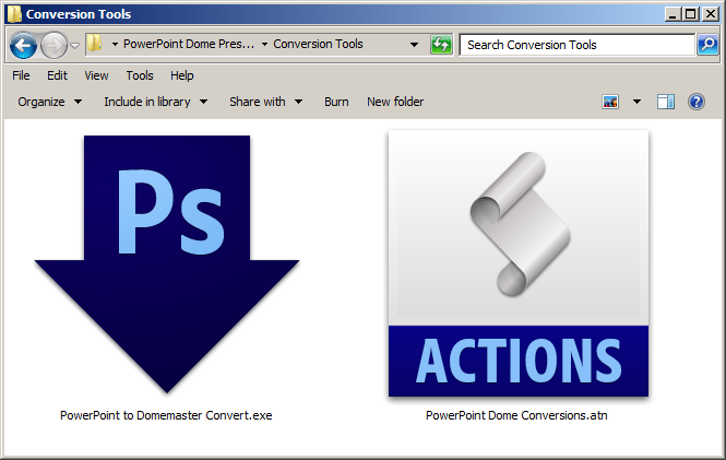 Si tiene Adobe Photoshop instalado en su sistema puede utilizar el programa de gotitas incluido llamado «PowerPoint to Domemaster Convert.exe» que se encuentra en la carpeta «Herramientas de conversión». El programa «PowerPoint to Domemaster Convert.exe» se ejecuta arrastrando una sola imagen o una carpeta de imágenes.PNG o.JPG al icono del programa. El droplet iniciará Adobe Photoshop y comenzará a procesar las imágenes.
